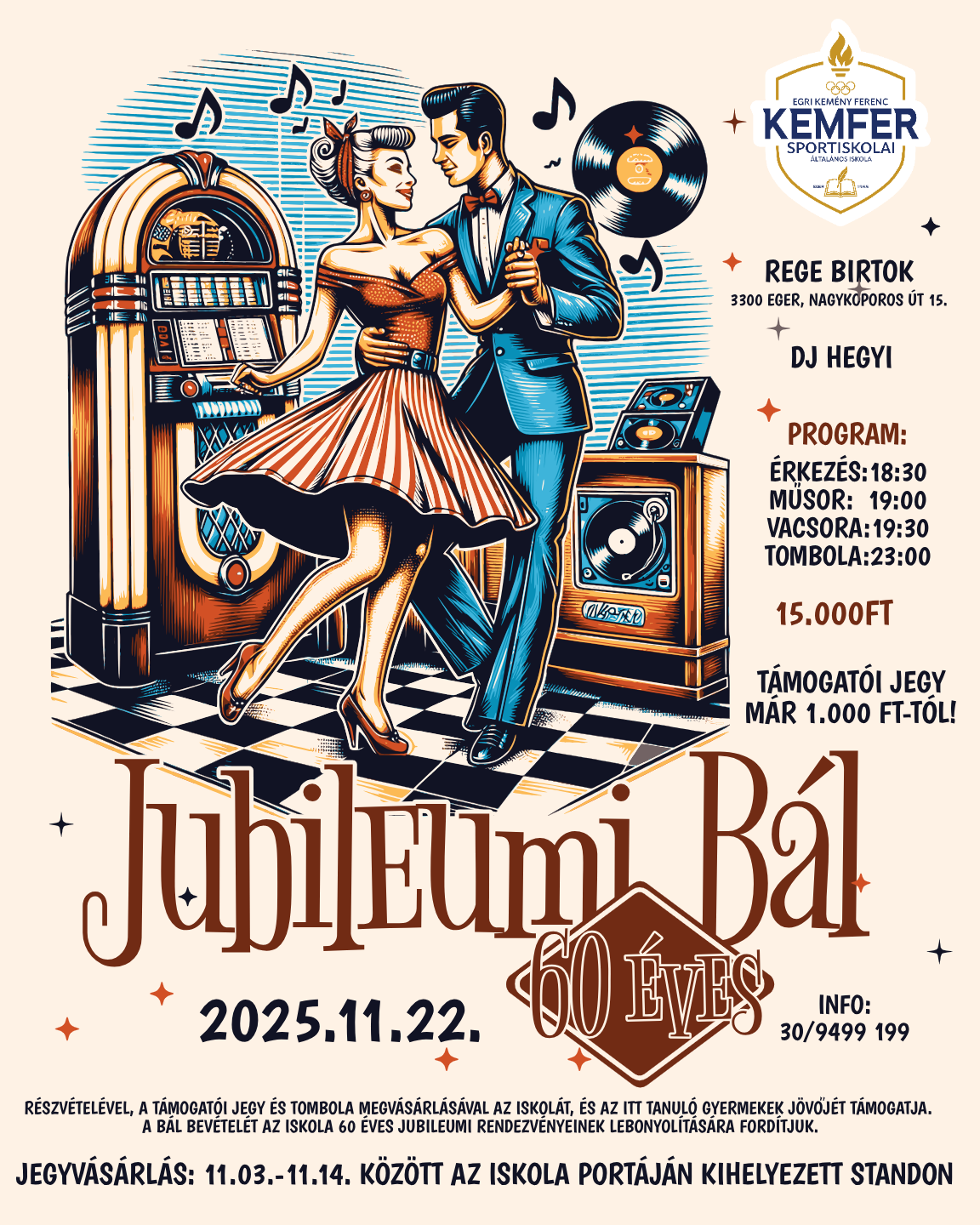 Helyszín: Rege Birtok (3300 Eger, Nagykőporos út 15.)Zene: DJ Hegyi Időpont: 2025. november 22. Program: Érkezés: 18:30 Műsor: 19:00 Vacsora: 19:30 Tombola: 23:00 Belépőjegy: 15.000 Ft Támogatói jegy: már 1.000 Ft-tól elérhető A részvétellel, a támogatói jegy és tombola megvásárlásával az iskolát és a diákok jövőjét támogathatják.A bál bevétele teljes egészében az iskola 60 éves […]